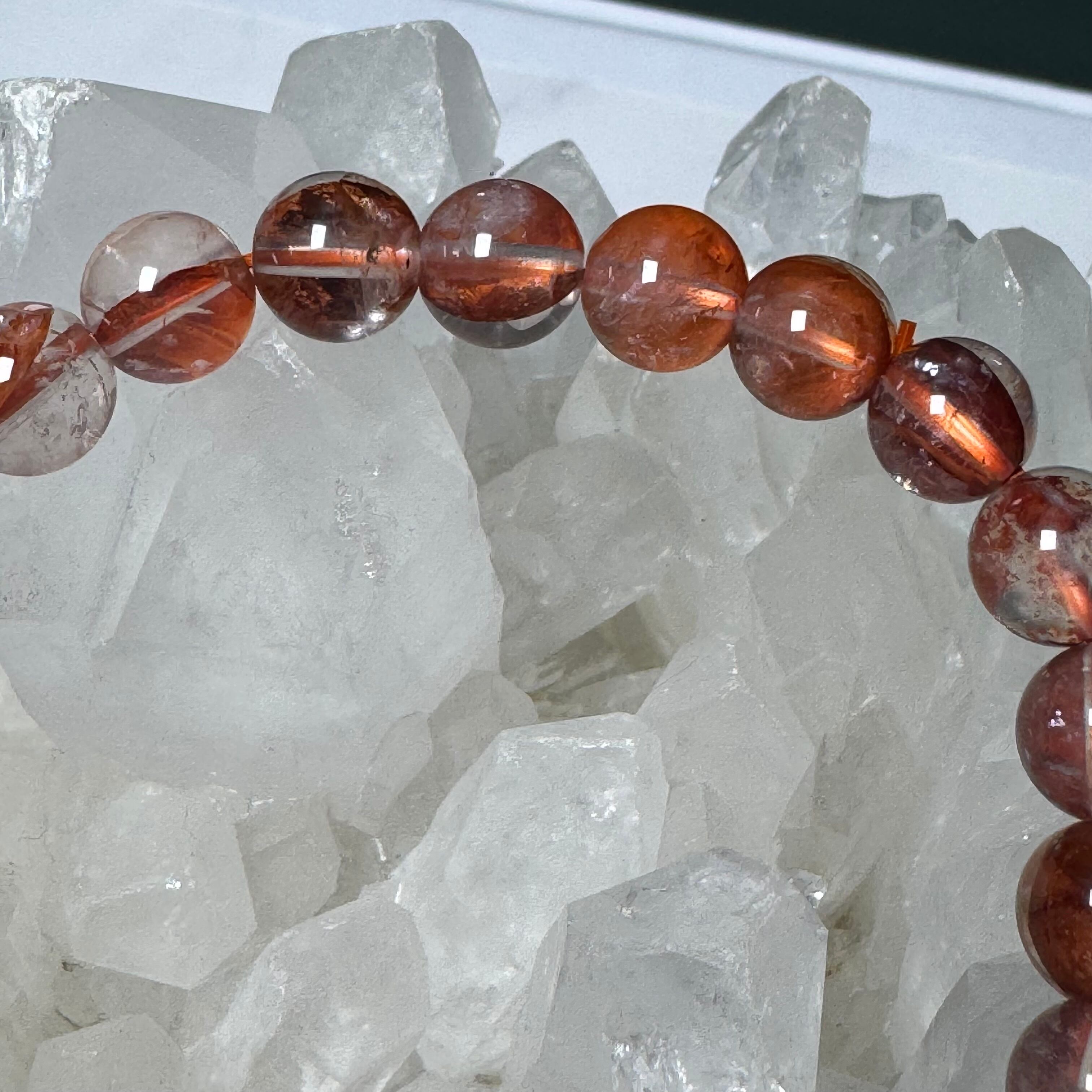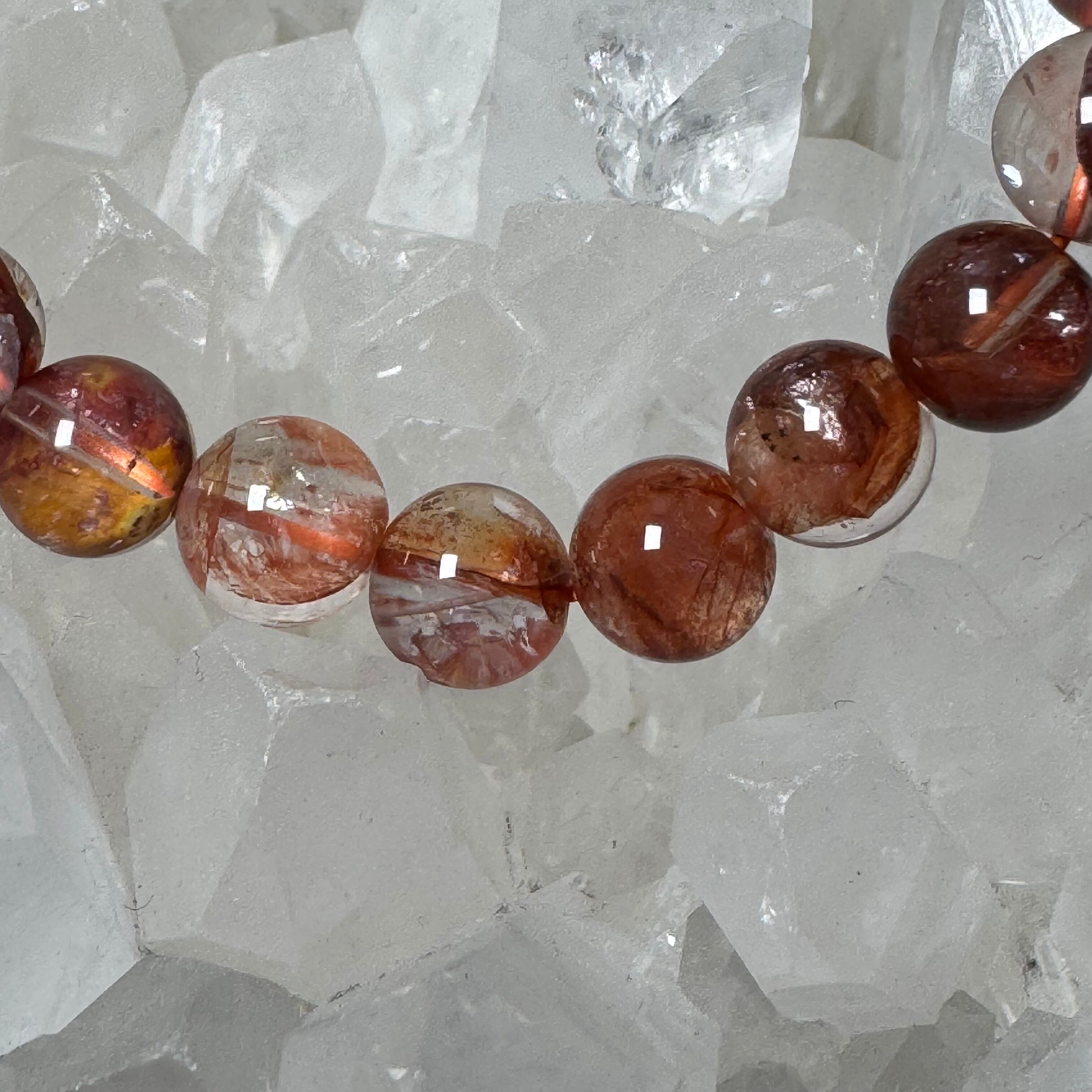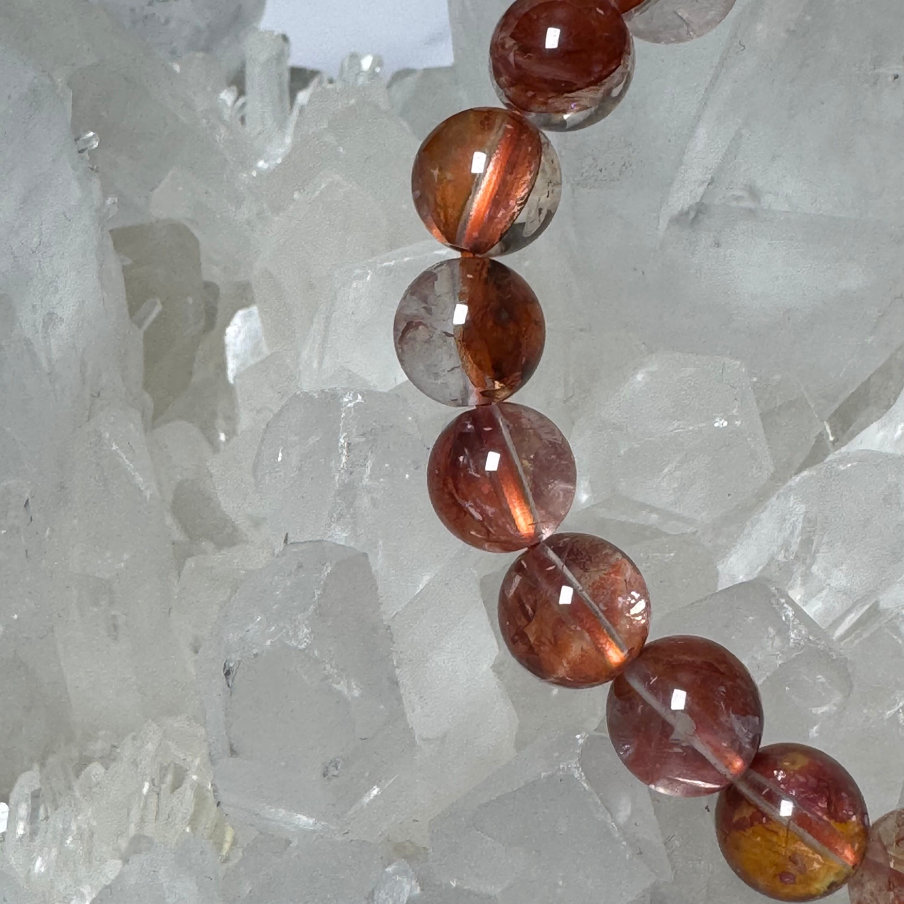 水晶の中にライモナイトやヘマタイトが染み込んで、赤色や黄色の膜が入っているとても綺麗な天然石です。