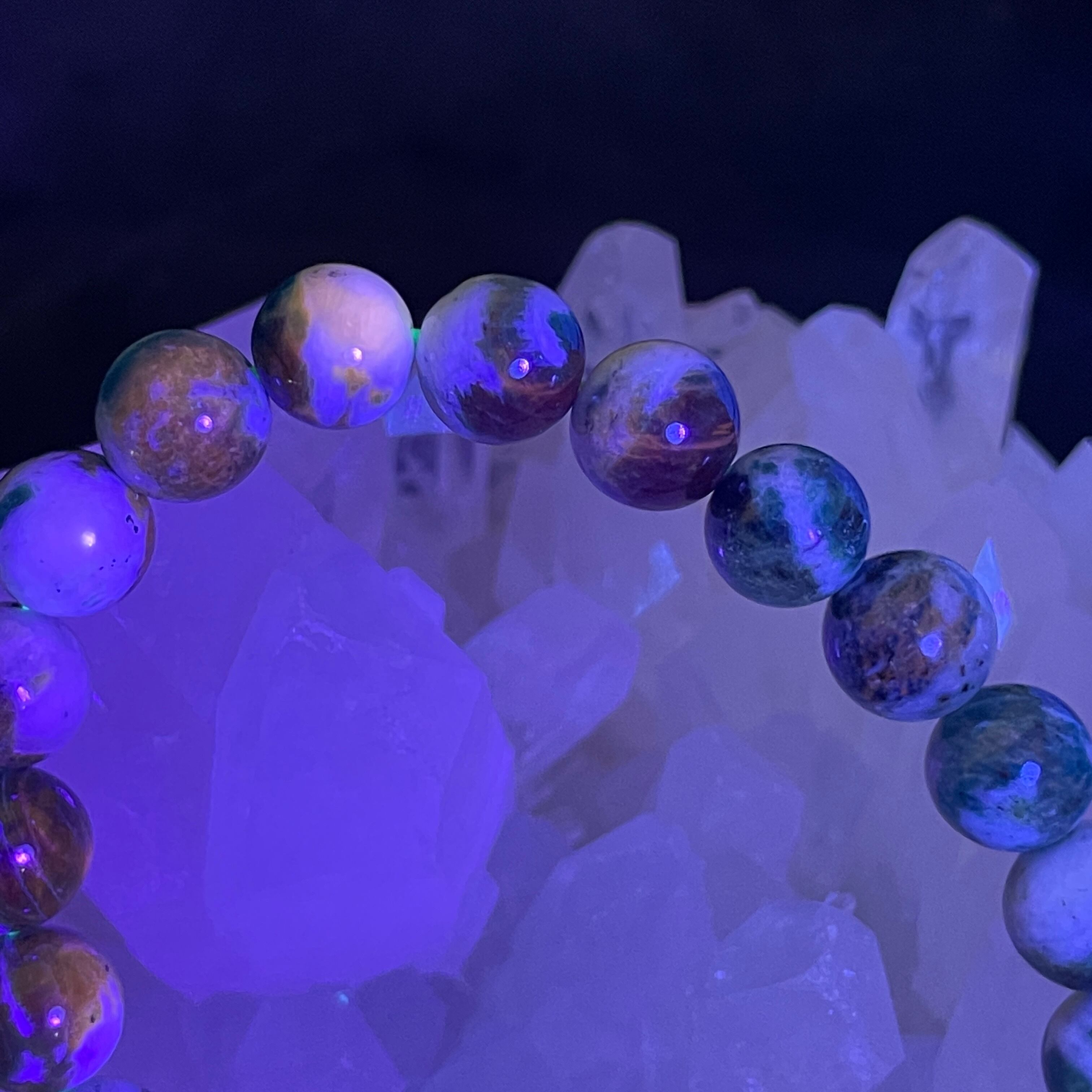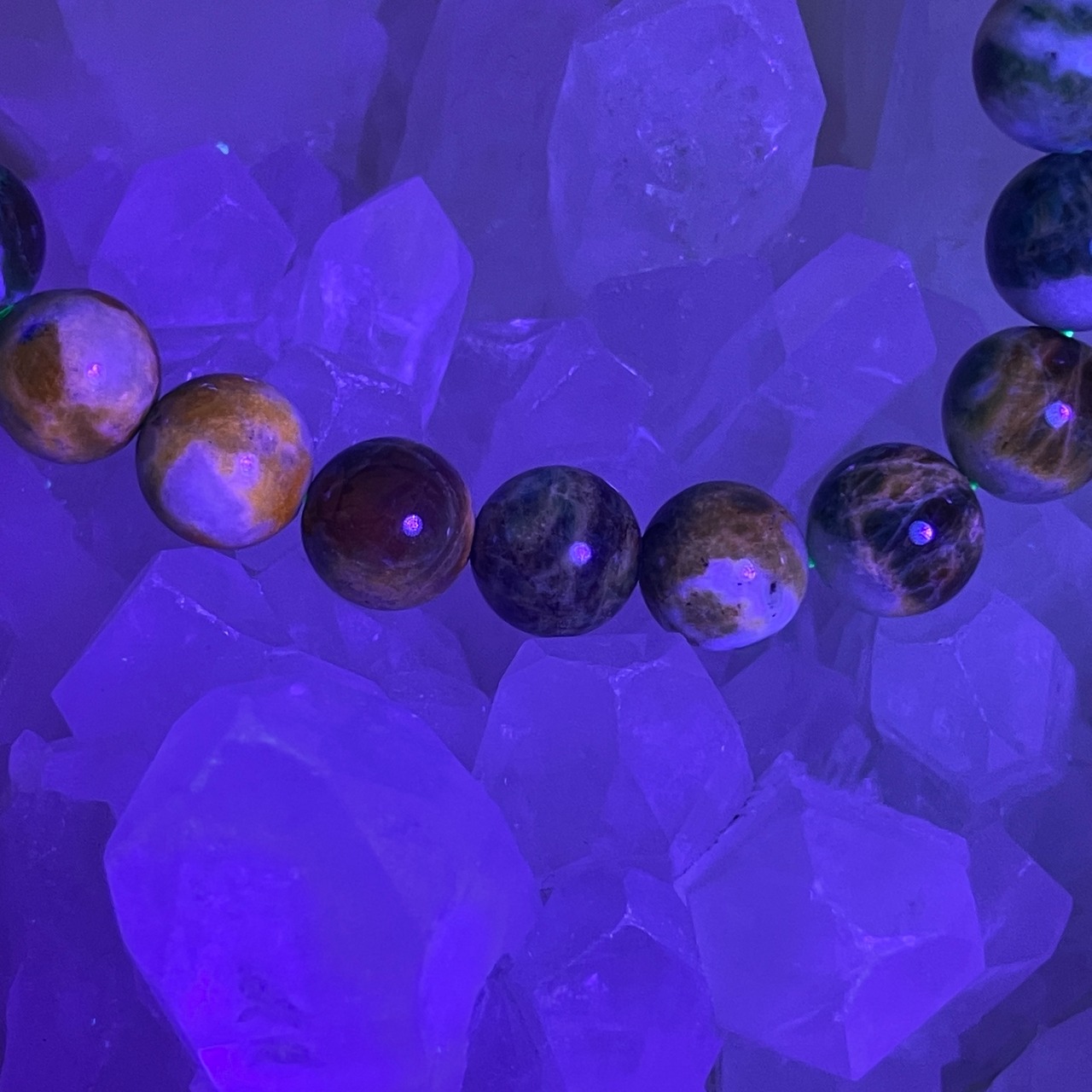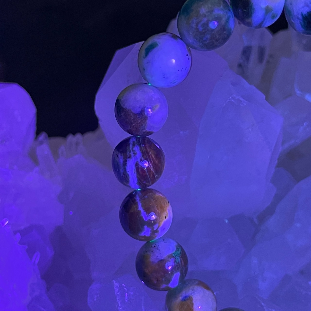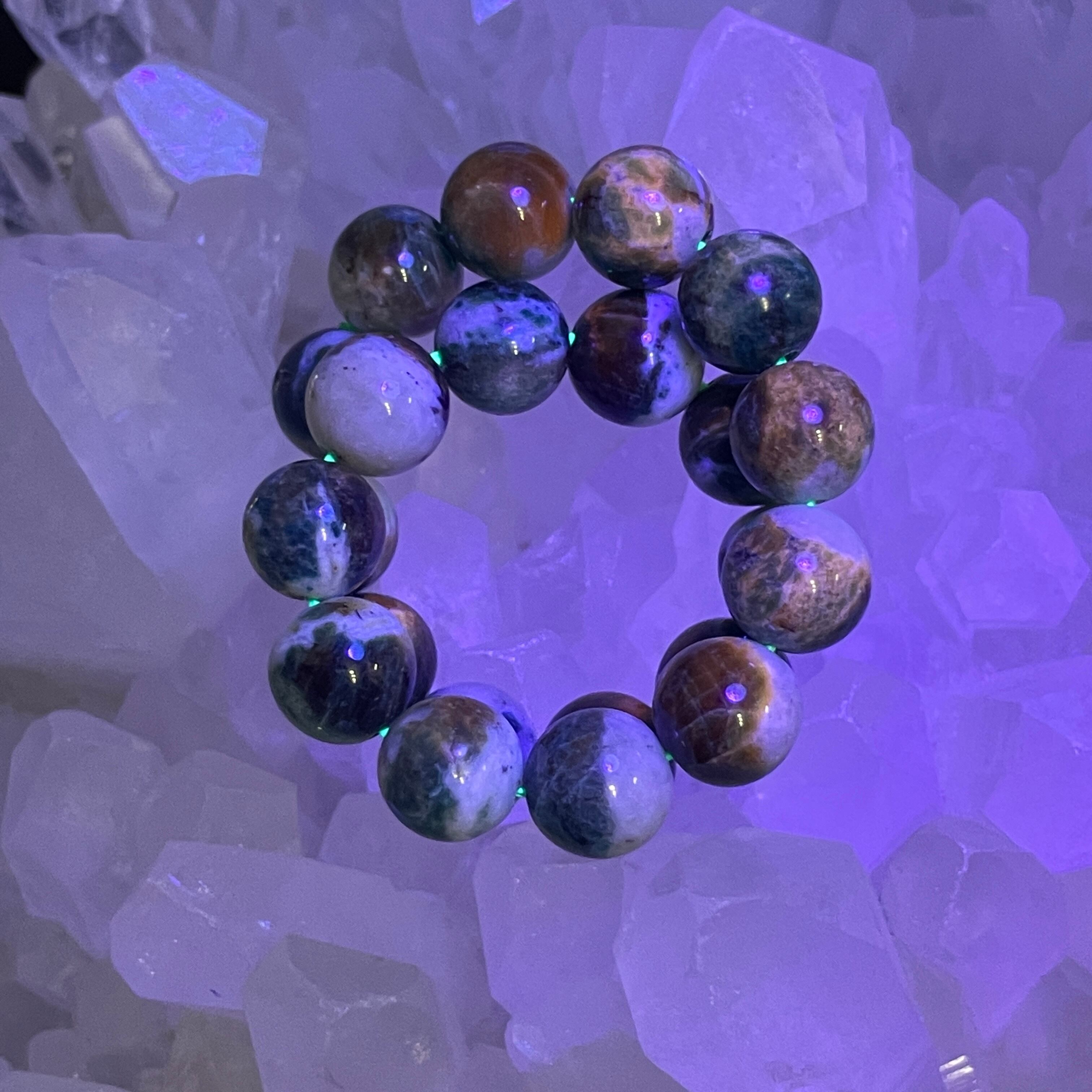 ブラックライトなどで紫外線を当てると、色が変色して濃くなって、時間が経つと元の色に戻るという希少な天然石です。