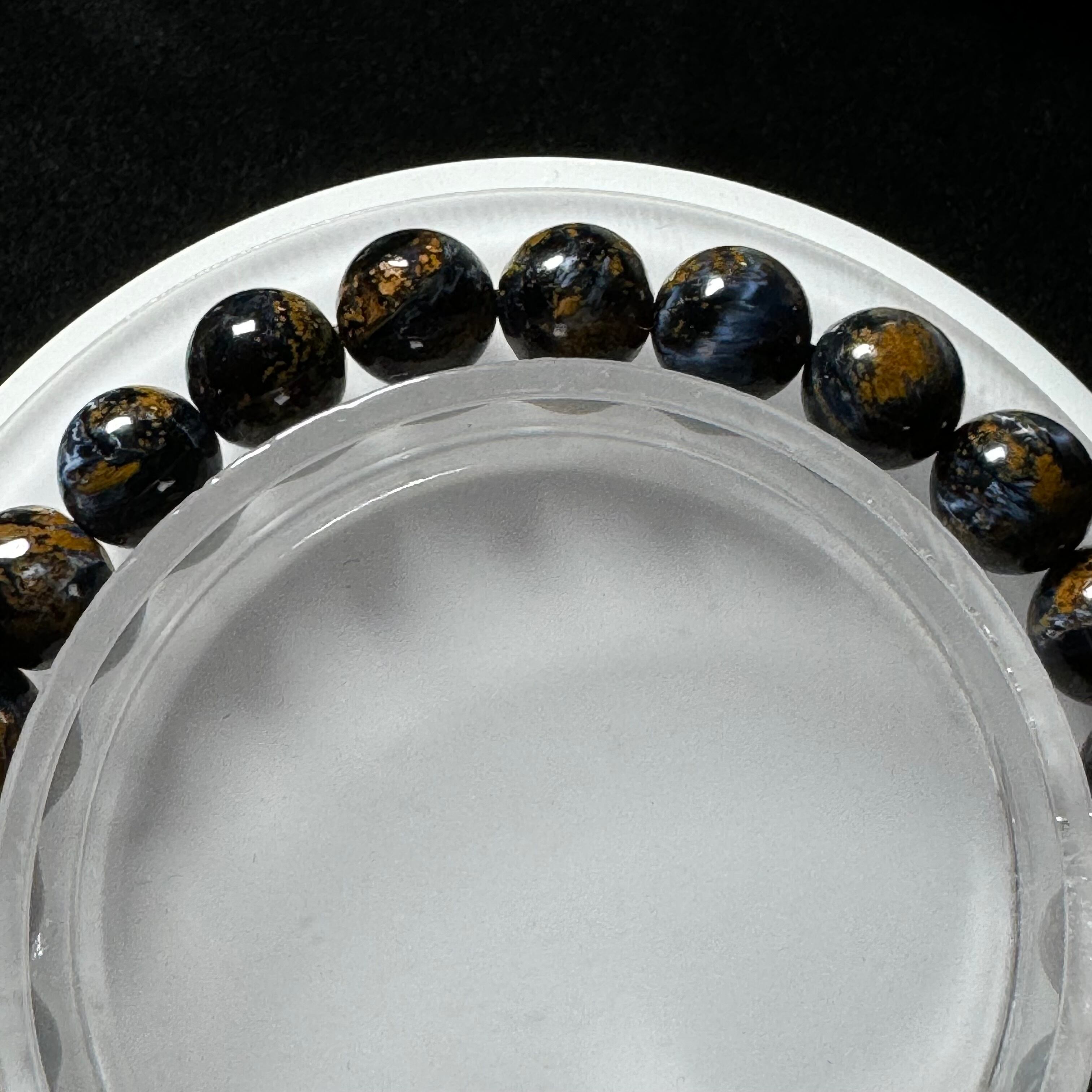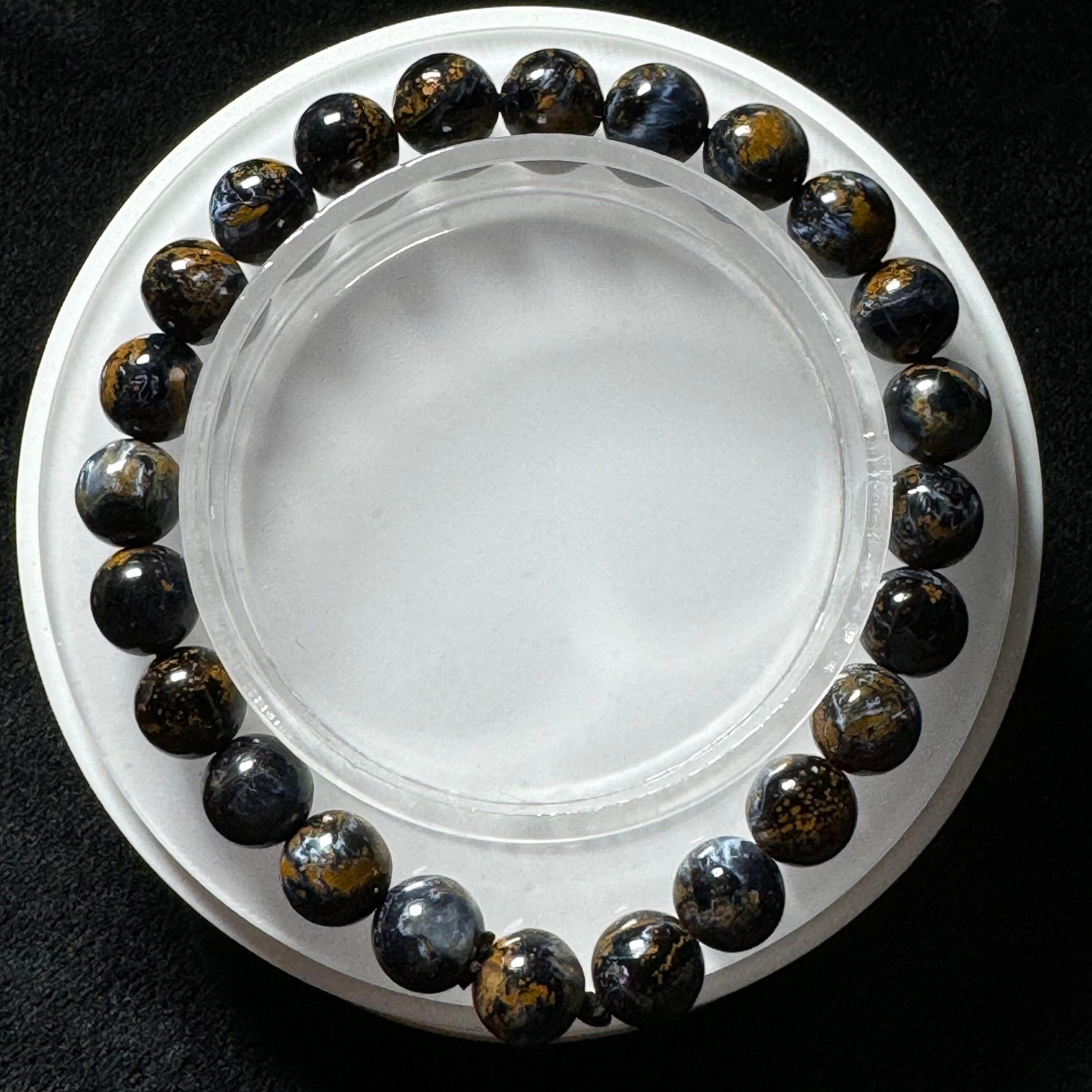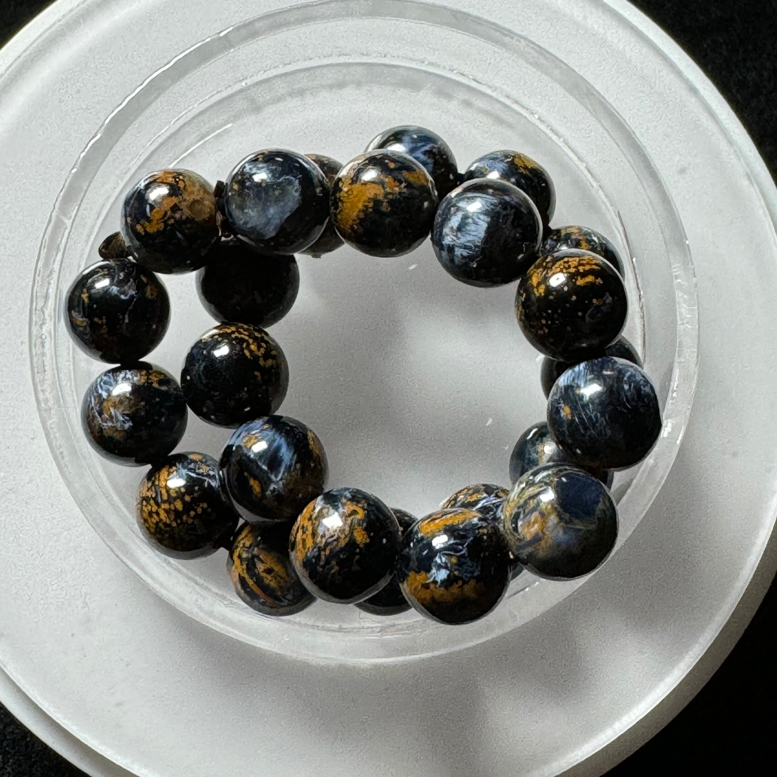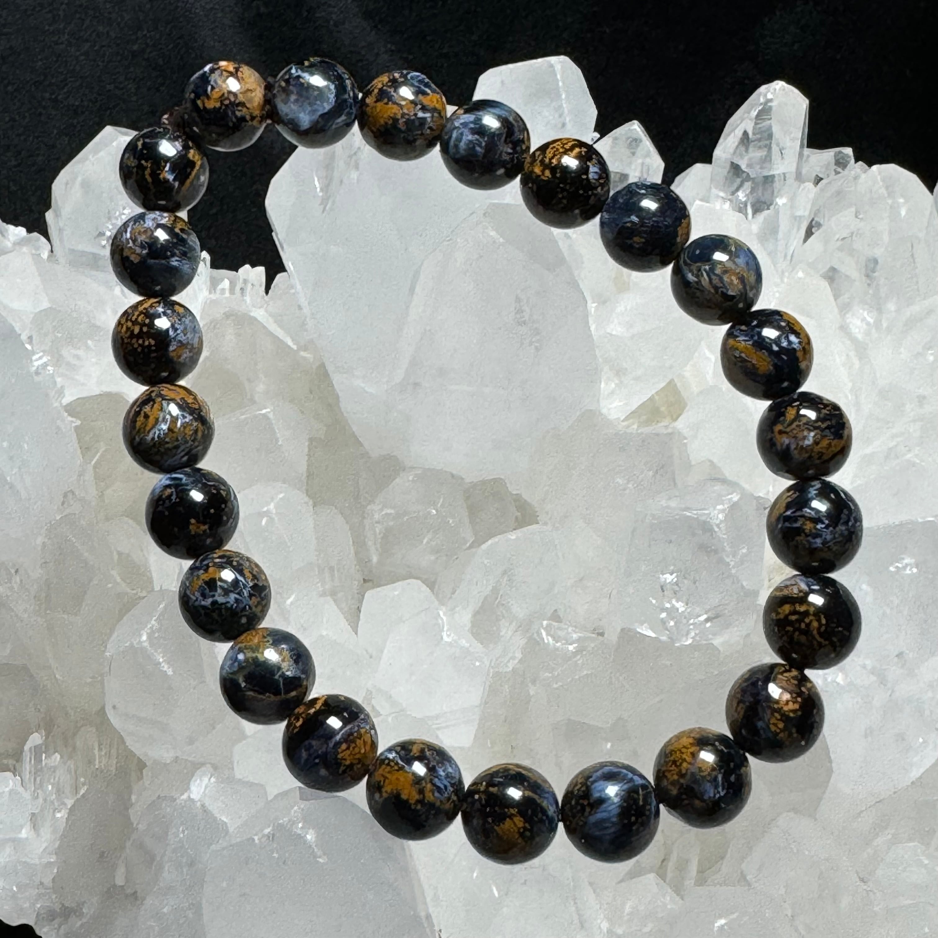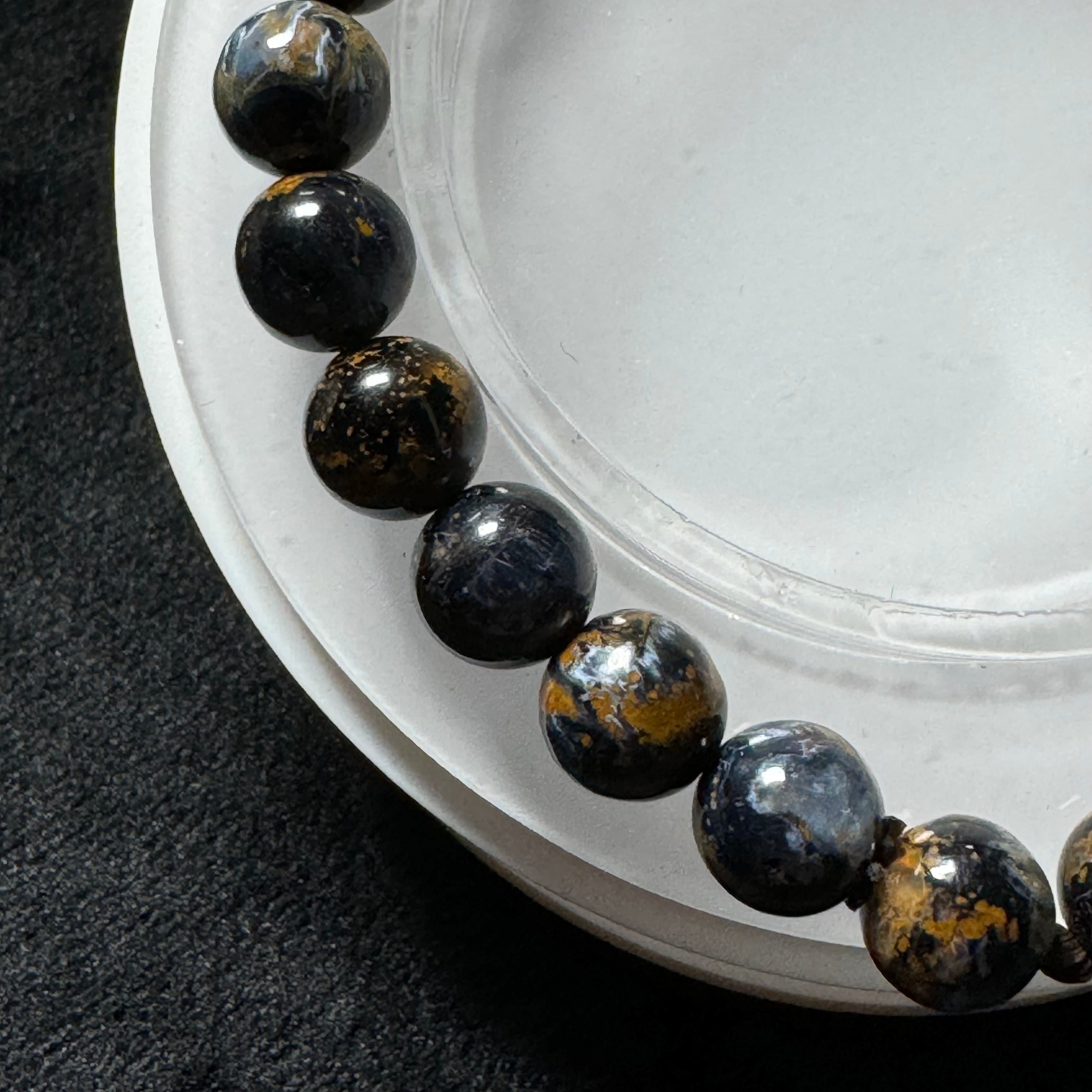 タイガーアイのように層状になっているわけではなく、他の成分と混ざって渦を巻いている中に、ギラギラ輝くシャトヤンシー効果が見られ、神秘的に見えます。